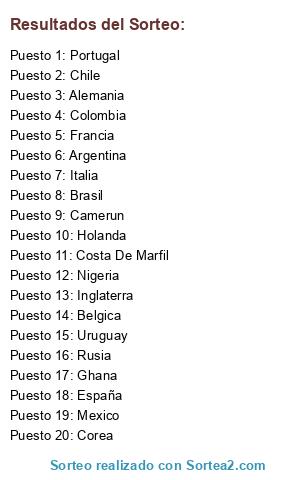 Lista de participantes: Brasil, Mexico, España, Holanda, Chile, Colombia, Uruguay, Inglaterra, Italia, Francia, Argentina, Alemania, Portugal, Belgica, Nigeria, Costa De Marfil, Ghana, Rusia, Corea, Camerun.