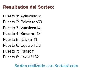 Lista de participantes: Davicin11, Pakirofr, Pelotazos69, Simarro_13, Javivi3182, Vanvicen14, Ayusosad84, Equalofficial.