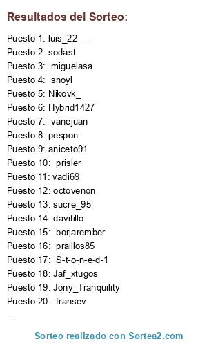 Lista de participantes: Jaf_xtugos , aniceto91, sucre_95 , bitan -, Nikovk_ , miguelasa , vadi69 , pespon , Lakored , prisler , sodast , borjarember, longchakal , praillos85 , luis_22 ---- , snoyl , octovenon , Jony_Tranquility , fransev , vanejuan , davitillo , S-t-o-n-e-d-1, Hybrid1427.