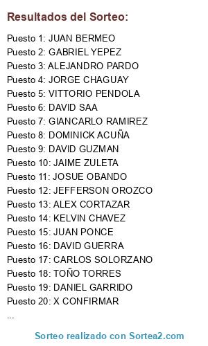 Lista de participantes: ABRAHAM MAXI, ADRIAN FARRO, ALEJANDRO PARDO, ALEX CORTAZAR, ALEXIS IDROVO, ALEXS VALLEJO, ANDRES GUAMAN, ANTHONY RODRIGUES, ARIEL GONZALEZ, AXEL RIVAS, BISMARK SANCHEZ, CARLOS ARANA, CARLOS CACERES, CARLOS CARCELEN, CARLOS ROMAN, CESAR SALINAS, CRISTHIAN CARPIO, CRISTHIAN VILLAMAR, CRISTIAN GORDON, CRISTIAN TOBAR, DANIEL GARRIDO, DANIEL PIÑEROS, DARIO MORLA, DAVID GUERRA, DAVID SAA, DIEGO GUZMAN, DIEGO SOLEDISPA, DOMINICK ACUÑA, EDISON BECERRA, EDUARDO ORTIZ, EDWIN SOLIS, ELVIS CENTENO, ERICK SERRANO, ESTEBAN HERMOZA, FABRY QUIJIJE, FELIPE MARQUEZ, FRANCIS DE LA TORRES, FRANCISCO VARELA, GABRIEL TOALA, GABRIEL YEPEZ, GIANCARLO RAMIREZ, IVAN TAPIA, JAIME DE LA CUADRA, JAIME ZULETA, JAVIER SOLEDISPA, JAVIER SOSA, JEAN TRUJILLO, JEFFERSON OROZCO, JENJOR ARCENTALES, JHON RUIZ, JOBY JOSEPH, JOEL ARROBO, JOHRDAN ARELLANO, JONATHAN MEDINA, JORGE CHAGUAY, JOSE BONIFAZ, JOSE FUENTES, JOSE PINARGOTE, JOSEPH TOMALA, JOSUE OBANDO, JOSUE ROMAN, JUAN BERMEO, JUAN CISNEROS, JUAN JIMENEZ, JUAN PONCE, JUAN WONG, JULIO FRANCO, KELVIN CHAVEZ, KENNELL VACACELA, KENNY ROSERO, KEVIN FRANCO, LUIS BARONA, LUIS CALDERON, MARCELO SECAIRA, MARCOS JARAMILLO, MARKO NAVARRETE, MARLON LOPEZ, MARLON PALADINEZ, MATEO PILLAJO, MATEO SERRANO, MATIAS UREÑA, MATT YEPEZ, MAURICIO ABARCA, MIGUEL MORA, NETO SANCHEZ, NEXAR TOALA, NICOLAS MONGE, OSCAR ENRIQUEZ, OSCAR LARREA, OSCAR TORRES, PABLO DELGADO, PABLO SOTOMAYOR, PAOLO MENESES, RICARDO ARROBO, RICKI VERDESOTO, ROBERTO FLORES, ROBERTO MORA, RONALD CRUZ, RONALD ZAMBRANO, RONALDO CRUZ, ROY FRANCO, SANTHIAGO MORAN, SANTIAGO CAMACHO, SEBAS MARTINEZ, SEBASTIAN AVILES, SEBASTIAN MENDOZA, TOÑO TORRES, VICENTE NICOLA, VITTORIO PENDOLA, VLADI ESCOBAR, WILSON GARCIA, YARI CAHUASQUI.