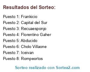 Lista de participantes: Florentino Gaher, Iceivan, Recuaesponjo, Abducido, Cholo Villaone, Capital del Sur, Frankicio, Rompeortos.