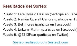 Lista de participantes: Miriam Herranz (participa en Facebook), Orianna Ch (participa en Facebook), Paqui Garcia Leon (participa en Facebook), Enkarni Martín (participa en Facebook), Nieves Alvarez (participa en Facebook), Oscar Brioso Borrero (participa en Facebook), Elizabeth Pozuelo (participa en Facebook), Vanesa Sanz (participa en Facebook), Lore Na C (participa en Facebook), Las recetas de María Antonia (participa en Facebook), Yeritza Lopez Yanca (participa en Facebook), Ramón Queralt Canora (participa en Facebook), Lourdes Alvarez Carpi (participa en Facebook), Cris Alva (participa en Facebook), Maria Angeles Lopez Galeote (participa en Facebook), Pitusa Moreno (participa en Facebook), Erandeni Estrada Ramirez (participa en Facebook), Ale Robles (participa en Facebook), Jesus Rodriguez Mellado (participa en Facebook), Rosalba Godinez Lopez (participa en Facebook), Marta Pérez Morente (participa en Facebook), Eva Iniguez (participa en Facebook), Lore Rodriguez Diez (participa en Facebook), Nany Lorenzo Rhodes (participa en Facebook), Bianca Mt (participa en Facebook), Lara Cossio Casuso (participa en Facebook), Rosa PFez (participa en Facebook), Almu Lopez (participa en Facebook), Loli Rojas Vera (participa en Facebook), Esther Kitty Pink (participa en Facebook), Carmen Noguerol Jiménez (participa en Facebook), Rosario Barbosa (participa en Facebook), Mónica Saiz (participa en Facebook), Beli Flores (participa en Facebook), Carolina Palenzuela Fernández (participa en Facebook), Rosa Pastora Martinez Vera (participa en Facebook), Joseline Chow Alvarado (participa en Facebook), Gemma Borrell (participa en Facebook), Ana Hilario (participa en Facebook), Sonia Valencia Duran (participa en Facebook), Natalia Cravero (participa en Facebook), Magdalena Alonso Otero (participa en Facebook), Tere Cantú (participa en Facebook), Sol Luna (participa en Facebook), Cristina González Villegas (participa en Facebook), Marta Ba (participa en Facebook), Victoria Adonai Raah (participa en Facebook), @unamentinquieta (participa en Twitter), @HimayZapateria (participa en Twitter), @ianou_ (participa en Twitter), @JasmineRabunal (participa en Twitter), @1313Fran (participa en Twitter), @PymesUnidasEs (participa en Twitter), @Kukutras28 (participa en Twitter), Charik Bautista (participa en Google+), Mónica Rodríguez García (participa en Google+), Maria Antonia Cantalejo (participa en Google+), inma Lopez (participa en Google+).