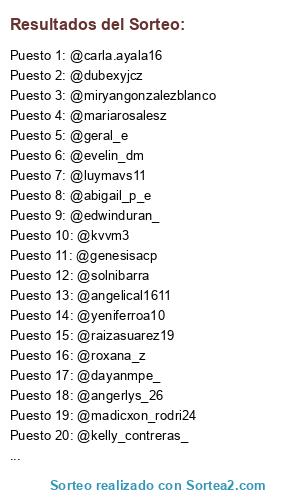 Lista de participantes: tachiraventasc, jun2806, alondracarache, xxibgbrla(5 participaciones), brialysrz, mariam028, janeisa.13, jenifer1309, pahola1988, jquirozguerrero(5 participaciones), marvicvz, natalia_medinaov_21, orianadoireerios, yanirag.02, blancaescalante37, insta_vallenato, __aleja.