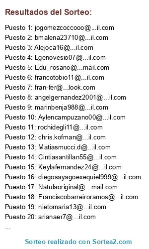 Lista de participantes: Email de contacto:, @abril111971, @abrilgalimberti, @Abrisuarez2002, @admtutiun, @Adrian.g.cinzano, @adrianaintanno, @Agostinaurquiza2309, @Agustin.cabj.95, @agustinabelen2022, @ainarabelencasarini, @Aixaacosta49, @Aixatoledano, @Alan.veizaga, @alansosa65, @alansvalencia, @aldanavarelacommunitymanager, @Aldanavictoriadandrea, @Alejoca16, @ally.lombeida, @amachiesa, @anabonissone, @angelanonimo01, @angelgernandez2001, @antonellabianca978, @antonellaleiva17, @antonellalobos646, @araceli.lorena.diaz.rojas, @ariana594069, @arianaer7, @arias1981.a, @arieslegend16, @axelguevara78, @ayala-leo, @Aylencampuzano00, @azutamurayo, @barbara_galeazza, @barbyk87, @bautidocegutie, @belchuottu, @belen.farias, @Belen.sansolini, @belenacosta84, @belenlodi, @beluai87, @bett.76, @bmalena23710, @brisamontenegro91, @bruni.emmanuel, @budonmicaela, @cachirc22, @camiiconde, @camilaetroncoso, @camilahuilen.cc, @camilathompson08, @campanellisergio, @Camy.txt, @candebodeg, @Candelaria.matos, @Carlos.cjuarez, @carmenechenique94, @castiglionesebastian, @Ceciand26, @ceciliabcorrea16, @cesmelisaok, @chevys.cardozo, @chris.kofman, @chriz.z, @chuman3568, @Cintiasantillan55, @Cnco0707, @colo234, @Comascofranco, @Connievidallucena, @corvalanraul613, @Coteee7913, @Cristina_e_y, @cusiniery, @daiananereasilva, @damiancousau, @danewcute, @daniel.vallejos.1981, @danielecasas.tato, @daniperru, @dariogf420, @Daviidch8, @Dci_28, @deborah.ferrer, @deferrari.mauricio, @diegosayagoexequiel999, @dilellecamila0, @dixnedsr, @dpartemi22, @Edu_rosano, @edutieti, @eliasmartinez, @elielvera, @Elisa.agustina, @elizabeth.marostica, @elseba_polly, @Ema.rey_90, @emi.acosta82, @emy.farfan, @erikacomelli954, @Esteban230791, @fabianaamc1, @faniaguirre2020, @fatimasoledadrojo, @fede.n.pereyra6983, @federico.gurrea, @Felixalagastino, @Figueredojorge, @flooresluis, @flor.aguirre707, @Florcarosanche05, @flordy.fer, @florenciarosalesc, @florgtti, @Franciscobarreiroramos, @Franco.ev7, @francotobio11, @fran-fer, @gachmza, @gallardodamian666, @garciazoe268, @Gaston_deandrade, @gastoncor95, @gauto.natalia, @german-osinskas, @gigi_rua, @gimena.bugiolachio, @Giselamcoronel, @glavallen, @gonzacarre.04, @gorosito985, @griffith.denise.03, @Guachilupe, @gustavbowie, @gutierrezcarolina640, @helgadebarone, @hernantullio, @iangorosito84, @imanolvalenzuela03, @ing.perdomopedro, @javierscalzone71, @Jhermahiony1410, @jijenez, @Jm.fontana, @joacorocca, @joaquinribeiro503, @jogomezcoccooo, @jolumi7, @Jon_s4_2013, @jonathan_casimiro10, @jonathancruz434, @jonirodas12, @jorgeietri, @josetorrealba238, @jozamilucila, @juanii.soto.r, @juliemgonzalez00, @juliettaylenarriola1982, @JulioCLedesma2, @JulioCLedesma2, @julyrrnqn8, @katy93e, @Keylafernandez24, @kiaragomez1925, @Km.saavedra13, @lagtz88, @laligancedo, @laureano.copes, @lautyrivas05, @lawolivieri, @lea_colon_87, @Leandroaguero228, @leandrovizcaya2004, @Leito2304, @leo.bustos194, @leonardofacca86, @leonelochoa817, @leostal, @Lgenovesio07, @lioricardo70, @lizetjesica, @lolocano141018, @lopezlauti12, @lorenaroccasalva.lr, @loubooks2, @lucasexequielalvarez, @lucasllimoscervera, @Lucasnicolas.1, @Lucia.valli.07, @luciacarolinamazza, @lucianaburgos36, @lucianademartino_, @lugarcia8217, @lukkaqac16, @lulamendez01, @Luli.costasaure97, @Lumanza1, @luzbpetroka.93, @luzgerakios1, @luztolaba823, @m.pada98, @ma_rouse_2701, @Mabelpalomo48, @mabonard, @Maca.aguilar96, @macarenaalbarracinuboldi, @Maitenmolina96, @marcelo1999antoniazzi, @Marchiaraviglio1, @margaritavandendooren, @mariaaristimu.ob, @marinbenja988, @martinaschonfeld, @martinezpm, @martinuretatorres, @matecerbelli, @matesagastume, @Matiasmucci.d, @matipiscitello3, @mauriham88, @may.miguell, @medmicaelarozar, @Melaniegonzalezperio, @Meli.l-, @melina_elmi, @mercedescamila2006, @miaseronello03, @mica_1132, @Mica_orlando, @micaela.ceciliap, @Micaelabocanera, @micamarshall1996, @Michelin27072007, @Miguelacho, @Miguelgarzon56, @Miguelgarzon56, @milagros.cami.molina, @milagros1943, @miltonmourao, @Milycoto468, @mmunoz, @mmxchik.o.o, @monasequeda11, @morenokevin119, @morgangibsonok, @morrasoledad504, @mundofranny, @nahugns, @naiybeni, @narellapontini, @Nataliaechegaray1993, @Natulaoriginal, @natycarello, @naylabrit9, @nicolaschambi27, @nicuria.14, @nietomaria13, @noelia.jad, @noeliapogonzaa, @Ornellacarano, @oropelbelen98, @oviedoayelen, @Pabloexeg, @patriciovernhet, @pauli.brunetti, @pereyralaura354, @pereyramay17, @Ponyfuxia, @ret2890, @rios.micaela.agustina, @ro.mil.bo, @rochidegli11, @rodriguezdamian272, @Romero.maca99, @rossimatias29, @rubii.rc, @Rubinettisophia, @s.e.noelia.m, @Saez.carola2012, @salchi24marcos, @sandrafelicitas1, @santii614, @sebastianfabiswine, @sergiorueja, @sespinoza0193, @siturria80, @Sll.juancruz, @smontagnaroconforti, @Sofi.bangertes, @sofi.m.parra, @sofiacardella5, @sofiaisla97, @somekindofweeaboo, @sousa1991magui, @startarezequiel, @svgroothuis, @taborda.juanpablo, @tamara_aye, @tamarabelnn1998, @tamiantho2020, @tamjaqaldama, @tatu2.5, @tizianomltizu, @tomasegresado08, @tomasezequielpino, @Valen.corral23, @valentinfurfa, @valeria_triplex, @valukukita, @Vanesagabyfely, @Vanesalievich, @velasquez.lauura, @velazquezabril8, @victor1win, @Victorialugea8, @victoriaricci14, @vilca576, @ximena.argenti, @xyprod22, @Yanina.e.pedraza, @yazchiappe, @zapatadario924, @Zarachonicolas2, @zoeetcheverry3.