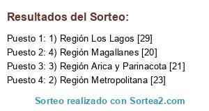 Lista de participantes: 1) Región Los Lagos [29], 2) Región Metropolitana [23], 3) Región Arica y Parinacota [21], 4) Región Magallanes [20].