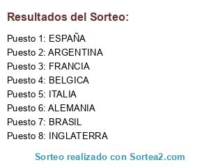 Lista de participantes: ALEMANIA, BRASIL, BELGICA, ARGENTINA, FRANCIA, ESPAÑA, ITALIA, INGLATERRA.