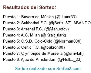 Lista de participantes: Arsenal F.C. (@Manugfcv), Ajax de Ámsterdam (@Nelka_23), Olympique de Marsella (@srrivlah), Celtic F.C. (@bukron00), C.S.D. Colo-Colo (@Norman000), Bayern de Múnich (@Juanr33), Sukhothai F.C. (@Betis_87) ABANDONO, A.C. Milan (@Krait_tiark).