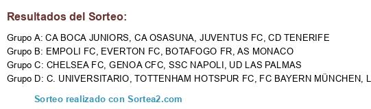 Lista de participantes: CHELSEA FC, GENOA CFC, EVERTON FC, EMPOLI FC, CA BOCA JUNIORS, SSC NAPOLI, CA OSASUNA, CD TENERIFE, JUVENTUS FC, LIVERPOOL FC, C. UNIVERSITARIO, FC BAYERN MÜNCHEN, BOTAFOGO FR, UD LAS PALMAS, AS MONACO, TOTTENHAM HOTSPUR FC.