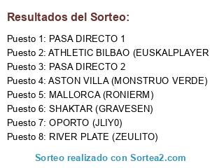 Lista de participantes: ASTON VILLA (MONSTRUO VERDE), PASA DIRECTO 1, OPORTO (JLIY0), ATHLETIC BILBAO (EUSKALPLAYER), SHAKTAR (GRAVESEN), RIVER PLATE (ZEULITO), PASA DIRECTO 2, MALLORCA (RONIERM).