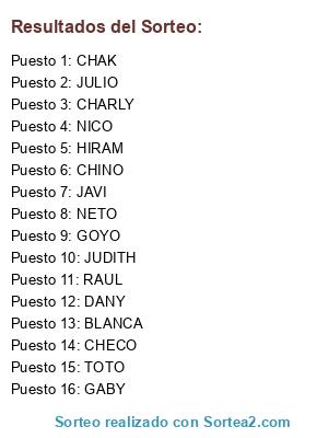 Lista de participantes: GOYO, NICO, JAVI, BLANCA, JUDITH, CHECO, GABY, CHARLY, CHINO, RAUL, HIRAM, JULIO, TOTO, CHAK, NETO, DANY.