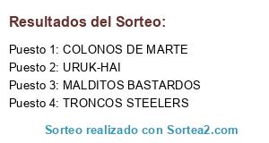 Lista de participantes: URUK-HAI, MALDITOS BASTARDOS, TRONCO STEELERS, COLONOS DE MARTE.