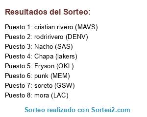 Lista de participantes: Nacho (SAS), Chapa (lakers), Fryson (OKL), mora (LAC), soreto (GSW), rodririvero (DENV), cristian rivero (MAVS), punk (MEM).