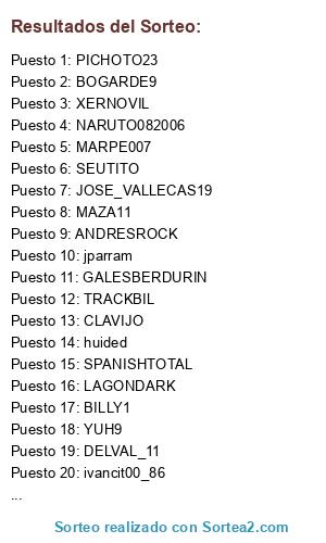Lista de participantes: VANMAMM, MARPE007, MAZA11, JOSE_VALLECAS19, SPANISHTOTAL, GORRI7, BOGARDE9, ECUADECORA, LIDER2012, PODER_NEGRITO1, ANDRESROCK, SEUTITO, KRATOS28, LAGONDARK, CLAVIJO, IVANX7, FERRY21, XERNOVIL, TRACKBIL, VICTOR_MOONO, NARUTO082006, M-R-L-S, PICHOTO23, MARIO13ARES, DELVAL_11, GALESBERDURIN, YUH9, BILLY1, Txito-21, jparram, ivancit00_86, huided.