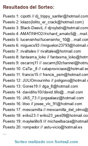 Lista de participantes: @Perdy_trs, @dj_trippy_sanfer, @jorge_fr85, @selinichev, @cataproviciaos, @er_makina1989, @lolito_er_crack, @oscarbird_88, @pichichi_neng, @djroybdn, @agustin_duran, @dani_caseria, @ajg_37, @poligono, @sete781, @hintoni, @chimeps3, @GETIYAED, @eriko23_pes09, @imanol_martinez, @luis___1983, @assalito, @richi_89_16, @mescamilla_del_olmo, @osvaldito9, @angelcop83, @Joselito_1003, @onecrack12, @michaelbacas, @javi_cs, @miguelon23793, @cortex_xx, @toor89, @richard_amato5, @rafana04, @kronen11, @cjimenez2010, @alicate_juan, @pokerdecuatro, @lucensinho_10, @astu-vicio, @josee_vlc_91, @fabro_3000, @rivaltales, @jorgealaez, @richi_i, @frias_01_liga, @francis_psm, @luigi_carras89, @fitipaldi_76, @granmago_ca, @raulmadridcf_, @david.tillo, @zequi_pes, @xdominx, @alexpayaruiz, @julien_faubert, @harrytxu, @oscarmj92channel, @dga_8, @sir_guti_taconazos_14, @Stoned_01_0, @fantasma_loko, @danpaulib.
