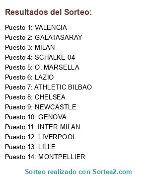 Lista de participantes: VALENCIA, MONTPELLIER, NEWCASTLE, CHELSEA, SCHALKE 04, GENOVA, O. MARSELLA, LIVERPOOL, LAZIO, INTER MILAN, ATHLETIC BILBAO, MILAN, GALATASARAY, LILLE.