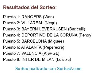 Lista de participantes: ATALANTA (Peperecre), VILLAREAL (Negri), BAYERN LEVERKUSEN (Baricelli), INTER DE MILAN (Luisixu), VALENCIA (AlePGL), RANGERS (Wan), DEPORTIVO DE LA CORUÑA (Fenoy), BARCELONA (Miguee).