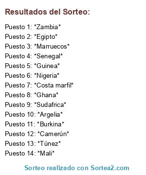 Lista de participantes: *Argelia*, *Burkina*, *Camerún*, *Costa marfil*, *Egipto*, *Ghana*, *Guinea*, *Mali*, *Marruecos*, *Nigeria*, *Senegal*, *Sudafrica*, *Túnez*, *Zambia*.
