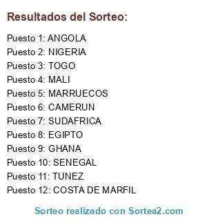 Lista de participantes: COSTA DE MARFIL, NIGERIA, CAMERUN, GHANA, SENEGAL, MARRUECOS, TOGO, SUDAFRICA, TUNEZ, ANGOLA, MALI, EGIPTO.