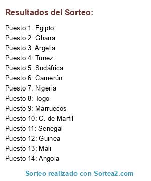 Lista de participantes: Angola, Camerún, C. de Marfil, Egipto, Ghana, Guinea, Mali, Marruecos, Nigeria, Senegal, Sudáfrica, Togo, Tunez, Argelia.
