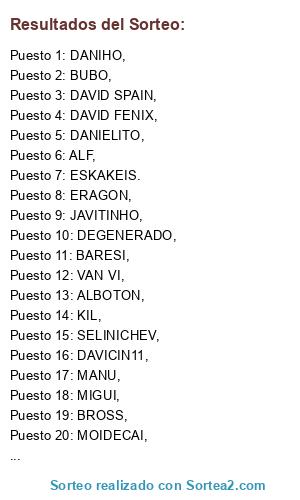 Lista de participantes: ERAGON,, MIGUELRP,, BARESI,, VAN VI,, MANU,, KIL,, PIPO,, DEGENERADO,, MIGUI,, DANIELITO,, EXTRE,, DAVID FENIX,, DAVICIN11,, ALBOTON,, MOIDECAI,, JORDI25,, SELINICHEV,, BUBO,, DANIHO,, BROSS,, DAVID SPAIN,, JAVITINHO,, ALF,, ESKAKEIS..