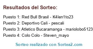 Lista de participantes: Colo Colo - Steven_mayo, Red Bull Brasil - K4len1to23, Atletico Bucaramanga - mariolobo5123, Deportivo Cali - pescali.