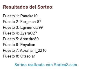 Lista de participantes: Enyalion, Egimendia99, ZysraC27, Paneke10, Aronsito89, Fer_man-87, Otasola1, Abraham_2210.
