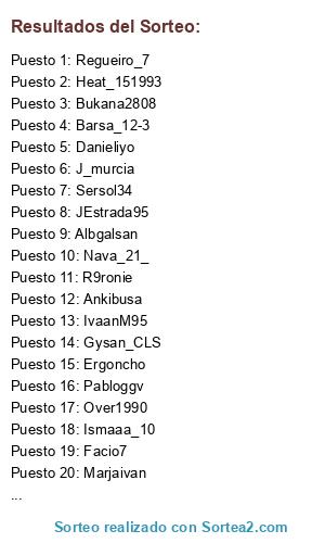 Lista de participantes: Danieliyo, Assasinstoto, IvaanM95, Over1990, JEstrada95, Albgalsan, Juangutierrez91, Pabloggv, Isma123i, Ramalho55, Nava_21_, Gysan_CLS, R9ronie, Hosquin7, Furru_asesino21, J_murcia, Katasurf-, Sersol34, Pelito10, Locobielsa89, Bukana2808, Pelizelli, Marjaivan, Barsa_12-3, Ankibusa, Ergoncho, Regueiro_7, Ismaaa_10, Jemi666, Facio7, Pedrovelasco95, Heat_151993.