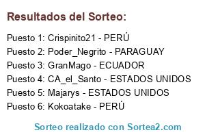 Lista de participantes: Poder_Negrito - PARAGUAY, GranMago - ECUADOR, Majarys - ESTADOS UNIDOS, CA_el_Santo - ESTADOS UNIDOS, Crispinito21 - PERÚ, Kokoatake - PERÚ.