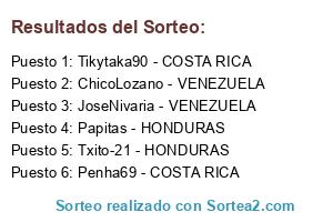 Lista de participantes: Tikytaka90 - COSTA RICA, Penha69 - COSTA RICA, ChicoLozano - VENEZUELA, JoseNivaria - VENEZUELA, Papitas - HONDURAS, Txito-21 - HONDURAS.
