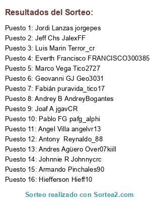 Lista de participantes: Johnnie R Johnnycrc, Armando Pinchales90, Pablo FG pafg_alphi, Luis Marin Terror_cr, Fabián puravida_tico17, Antony Reynaldo_88, Andres Agüero Over07kiill, Andrey B AndreyBogantes, Joaf A jgavCR, Geovanni GJ Geo3031, Jeff Chs JalexFF, Hiefferson Hieff10, Angel Villa angelvr13, Jordi Lanzas jorgepes, Marco Vega Tico2727, Everth Francisco FRANCISCO300385.