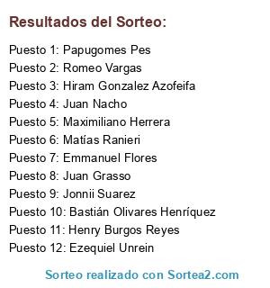Lista de participantes: Romeo Vargas, Ezequiel Unrein, Juan Grasso, Matías Ranieri, Henry Burgos Reyes, Bastián Olivares Henríquez, Maximiliano Herrera, Juan Nacho, Emmanuel Flores, Hiram Gonzalez Azofeifa, Jonnii Suarez, Papugomes Pes.