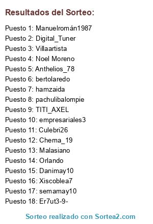 Lista de participantes: empresariales3, Culebri26, bertolaredo, Xiscoblea7, semamay10, pachulibalompie, Digital_Tuner, Chema_19, Danimay10, Villaartista, Er7ut3-9-, Manuelromán1987, hamzaida, TITI_AXEL, Malasiano, Anthelios_78, Noel Moreno, Orlando.