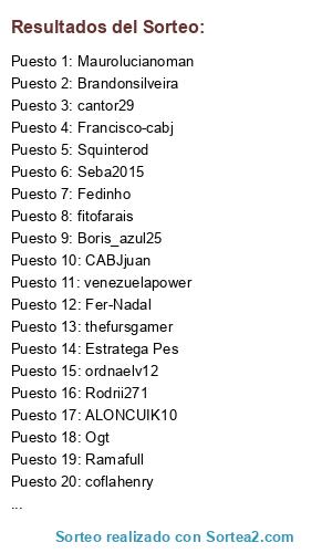 Lista de participantes: venezuelapower, JORGE-RIVER, Davigol, Krilin18, ManuelReinoso, Brandonsilveira, Seba2015, Fedinho, Rodrii271, jorgeortiz15, CABJjuan, ALONCUIK10, Squinterod, Lk20, Raidenkiller, Luis0303, Maurolucianoman, Andresmoron, Ogt, Russitooo, cantor29, Ramafull, Elchila2015, Boris_azul25, Vitorsfc, Kimimarofd, Francisco-cabj, fitofarais, thefursgamer, Rodrigo2024, coflahenry, Joaquing84, Estratega Pes, Fer-Nadal, Pablo15, ordnaelv12.