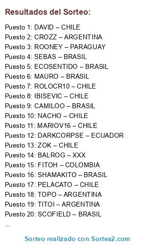 Lista de participantes: MANO WAR - XXX, HERLAST – BRASIL, DREYK0 –ARGENTINA, CAMILOO – BRASIL, XAVI – XXX, MONIPO – ARGENTINA, Z7 – CHILE, MARIOV16 – CHILE, XUNXO – XXX, FX – MEXICO, DARKCORPSE – ECUADOR, NACHO – CHILE, SEBAS – BRASIL, ROLOCR10 – CHILE, FBN – CHILE, KEZON – URUGUAY, FITOH – COLOMBIA, XPEKTRO – BRASIL, OPTIMUS – CHILE, MAURO – BRASIL, TITOI – ARGENTINA, BLACKBUICK – BRASIL, ROONEY – PARAGUAY, IBISEVIC – CHILE, ZOK – CHILE, PARME – URUGUAY, SCOFIELD – BRASIL, PELACATO – CHILE, SOCRAM – BRASIL, NEGRO – URUGUAY, TACH – PARAGUAY, HUGO – URUGUAY, UCLULOUC – BRASIL, DOS P– PARAGUAY, KIKE – URUGUAY, ZEGA – ARGENTINA, TOPO – ARGENTINA, ECOSENTIDO – BRASIL, CROZZ – ARGENTINA, ALVARILLO – BRASIL, KATOH – MEXICO, CHXCK – CHILE, POKEFLAY – BRASIL, DANI PES – CHILE, SNOOP – CHILE, ADRIAN – CHILE, BASTIAN – ARGENTINA, BALROG – XXX, EL MIMO – URUGUAY, DAVID – CHILE, DARKOX – CHILE, KENDO – ARGENTINA, IBRA – PARAGUAY, SHAMAKITO – BRASIL.