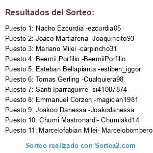 Lista de participantes: Chumi Mastronardi- Chumiakd14, Joakoo Danessa -Joakodanessa, Joaco Martiarena -Joaquincito93, Santi Iparraguirre -si41007874, Marcelofabian Milei- Marcelobombero, Mariano Milei -carpincho31, Beernii Porfilio -BeerniiPorfilio, Esteban Bellapianta -estiben_iggor, Nacho Ezcurdia -ezcurdia05, Emmanuel Corzon -magician1981, Tomas Gerling -Cualquiera98.