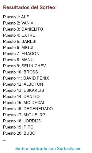 Lista de participantes: ALF, VAN VI, DANIELITO, EXTRE, BARESI, MIGUI, ERAGON, MANU, SELINICHEV, BROSS, DAVID FENIX, ALBOTON, ESKAKEIS, DANIHO, MOIDECAI, DEGENERADO, MIGUELRP, JORDI25, PIPO, BUBO, JAVITINHO, KIL, DAVICIN11, DAVID SPAIN.