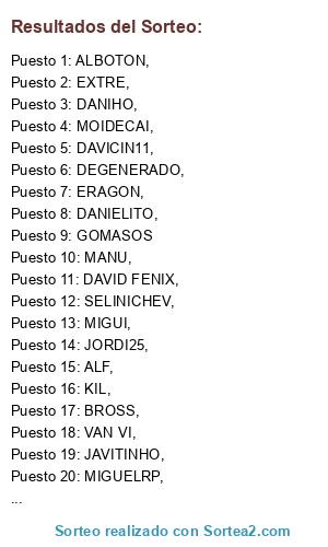Lista de participantes: ERAGON,, MIGUELRP,, BARESI,, VAN VI,, MANU,, KIL,, PIPO,, DEGENERADO,, MIGUI,, DANIELITO,, EXTRE,, DAVID FENIX,, DAVICIN11,, ALBOTON,, MOIDECAI,, JORDI25,, SELINICHEV,, BUBO,, DANIHO,, BROSS,, DAVID SPAIN,, JAVITINHO,, ALF,, ESKAKEIS., GOMASOS.