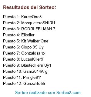Lista de participantes: KarecOne8, RODRI FELMAN 7, Gsm2014Arg, LucasKiller9, Pringle911, Gonzalosalto, Ciopo 99 Uy, Gonzalito55, MosqueteroSHIRU, Elkoller, BlastedFern Uy1, Kit Walker One.