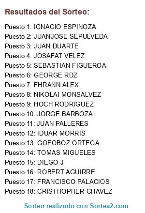 Lista de participantes: FHRANN ALEX, JUANJOSE SEPULVEDA, TOMAS MIGUELES, JUAN DUARTE, JUAN ANDRES, SEBASTIAN FIGUEROA, CRISTHOPHER CHAVEZ, LUIS MATURANA, SEBASTIAN TOREES, NIKOLAI MONSALVEZ, PABLO BRAVO, JUAN PALLERES, ALBERTO RODRIGUEZ, SANDRO AYALA, GERARDO HEREDIA, PEPE PEREZ, LUIS NOVOA, GEORGE RDZ, PATRICK VILLAGRAN, JUAN TINEZ, JAVIER CASTILLO, IGNACIO ESPINOZA, FERNANDO OSCAR, JOSAFAT VELEZ, WILLIAM CORVALAN, UN TAL HECTOR, JORGE BARBOZA, DIEGO J., CORONADO ANDRES, FRANCISCO PALACIOS, HOCH RODRIGUEZ, JHON HERRERA, ROBERT AGUIRRE, GOFOBOZ ORTEGA, IDUAR MORRIS, GLOBO OSCAR.