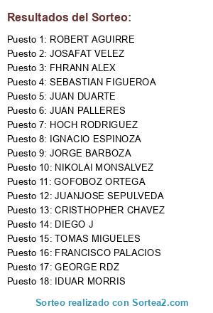 Lista de participantes: HOCH RODRIGUEZ, JUAN DUARTE, ROBERT AGUIRRE, SEBASTIAN FIGUEROA, JUANJOSE SEPULVEDA, JOSAFAT VELEZ, JORGE BARBOZA, NIKOLAI MONSALVEZ, TOMAS MIGUELES, DIEGO J, CRISTHOPHER CHAVEZ, FRANCISCO PALACIOS, FHRANN ALEX, IDUAR MORRIS, GEORGE RDZ, IGNACIO ESPINOZA, GOFOBOZ ORTEGA, JUAN PALLERES.