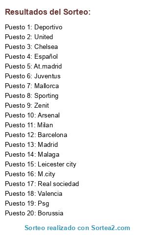 Lista de participantes: Madrid, United, Deportivo, Borussia, Zenit, Barcelona, Juventus, Chelsea, Español, Psg, Mallorca, Malaga, Valencia, At.madrid, Real sociedad, Milan, Arsenal, Sporting, M.city, Leicester city.