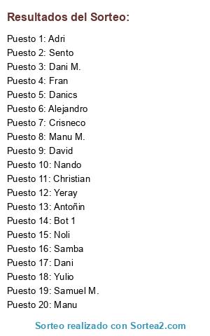 Lista de participantes: Yeray, Crisneco, Sento, Nando, Adri, Alejandro, Antoñin, Christian, Dani, Danics, Dani M., David, Samuel M., Manu, Manu M., Noli, Samba, Fran, Yulio, Bot 1.