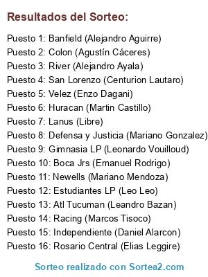 Lista de participantes: Colon (Agustín Cáceres), Boca Jrs (Emanuel Rodrigo), Huracan (Martin Castillo), River (Alejandro Ayala), Banfield (Alejandro Aguirre), Racing (Marcos Tisoco), Rosario Central (Elias Leggire), Lanus (Libre), Gimnasia LP (Leonardo Vouilloud), Newells (Mariano Mendoza), Defensa y Justicia (Mariano Gonzalez), Atl Tucuman (Leandro Bazan), Independiente (Daniel Alarcon), San Lorenzo (Centurion Lautaro), Estudiantes LP (Leo Leo), Velez (Enzo Dagani).