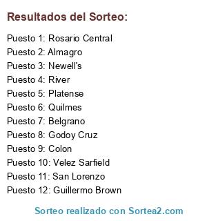 Lista de participantes: Guillermo Brown, Rosario Central, San Lorenzo, Platense, Belgrano, River, Velez Sarfield, Newell's, Godoy Cruz, Colon, Quilmes, Almagro.