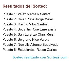 Lista de participantes: Racing - Vitor Santos, Boca Jrs - Cse Emelexista, River Plate - Jorge Meler, San Lorenzo - Chris Ruiz, Newells - Alfonso Sepulveda, Estudiantes - Russo Carlos, Velez - Marcelo Seifert, Belgrano - Nico Varela.