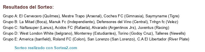 Lista de participantes: Defensores del Vino (Central), Torino (Godoy Cruz), Monterrey (Estudiantes), Acidos FC (Rafaela), La Mitad (Boca), San Lorenzo (San Lorenzo), Manuk Fc (Independiente), Tnhgn fc (Velez), West London White (belgrano), C.A El Libertador (River Plate), Talleres (Newells), Naftasuper (Lanus), El Cervecero (Quilmes), Juventus (Racing), Saymyname (Tigre), Alvarado (Argentinos Jrs), Coches FC (Gimnasia), Roland FC (Colon), Mestre Trapo (Arsenal), America (banfield).
