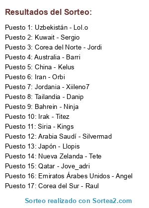 Lista de participantes: Australia - Barri, Bahrein - Ninja, China - Kelus, Iran - Orbi, Irak - Titez, Japón - Llopis, Jordania - Xiileno7, Kuwait - Sergio, Corea del Norte - Jordi, Qatar - Jove_adri, Arabia Saudí - Silvermad, Corea del Sur - Raul, Siria - Kings, Tailandia - Danip, Emiratos Árabes Unidos - Angel, Uzbekistán - Lol.o, Nueva Zelanda - Tete.