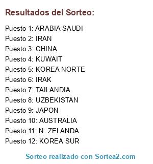 Lista de participantes: KOREA SUR, JAPON, AUSTRALIA, KUWAIT, ARABIA SAUDI, N. ZELANDA, UZBEKISTAN, CHINA, KOREA NORTE, IRAN, IRAK, TAILANDIA.