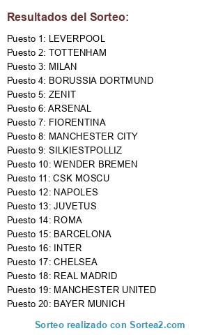 Lista de participantes: BARCELONA, REAL MADRID, MANCHESTER CITY, MILAN, CHELSEA, MANCHESTER UNITED, CSK MOSCU, BAYER MUNICH, ARSENAL, INTER, JUVETUS, FIORENTINA, LEVERPOOL, ROMA, TOTTENHAM, ZENIT, NAPOLES, WENDER BREMEN, BORUSSIA DORTMUND, SILKIESTPOLLIZ.