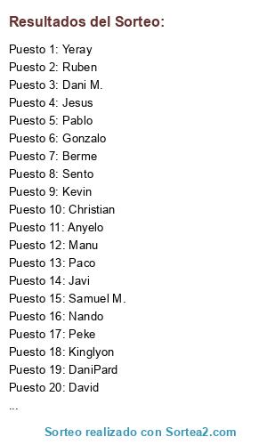 Lista de participantes: David, DaniV, Yeray, Jesus, Nando, Maryus, Paco, Nono, Berme, Gonzalo, Yulio, Kevin, Anyelo, Manu, Pablo, Peke, Javi, Sento, DaniPard, Ruben, Kinglyon, Dani M., Samuel M., Christian.